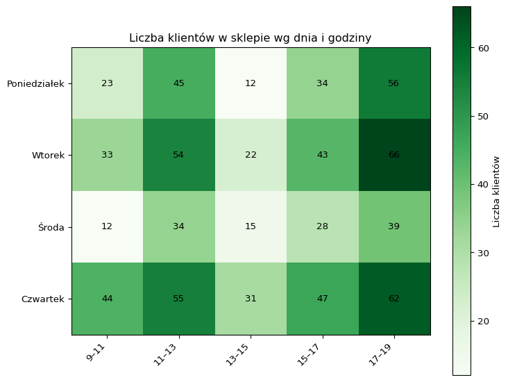 'Liczba klientów': [50, 60, 55, 65, 80, # Rano