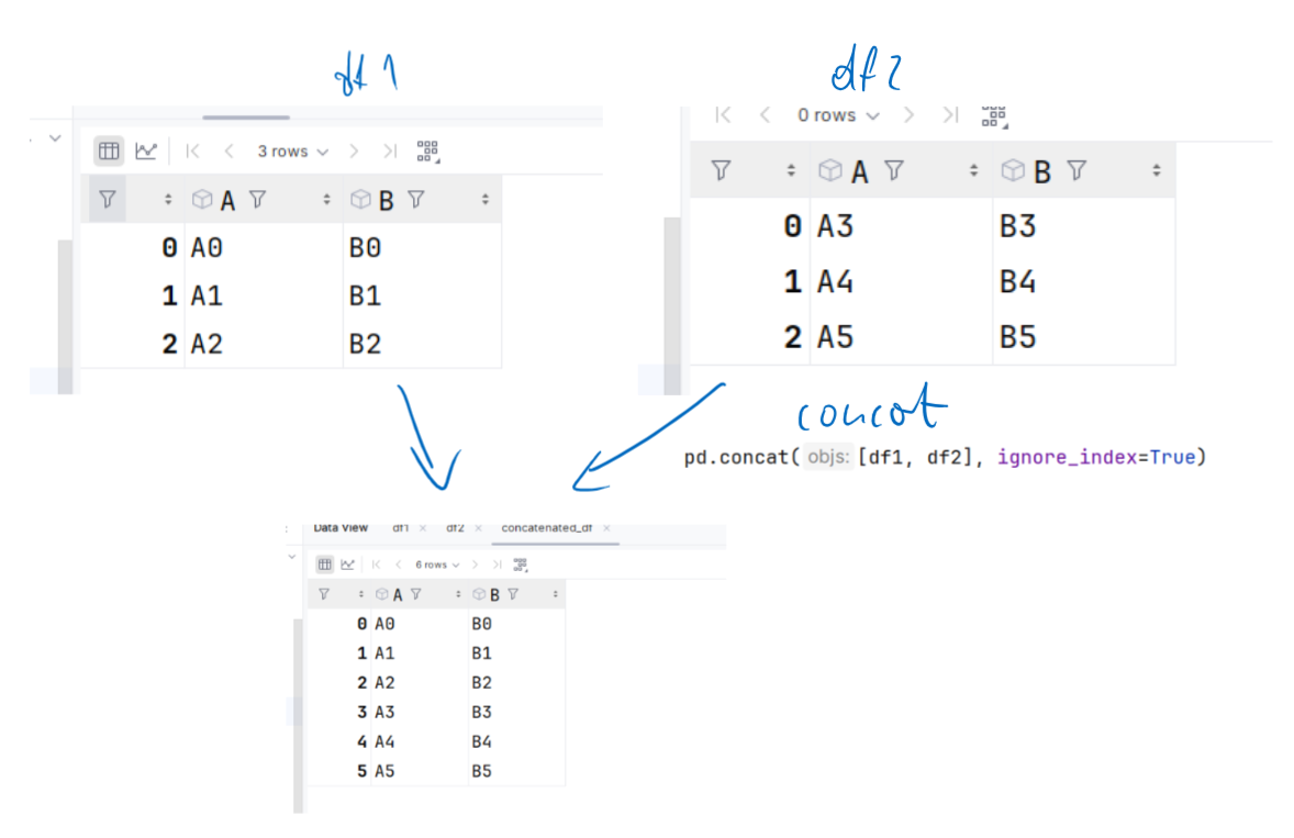 axis: oś, wzdłuż której chcesz łączyć ramki danych. Domyślnie to 0 (łączenie wierszy, pionowo), ale można także ustawić na 1 (łączenie kolumn, poziomo).