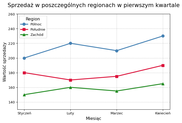 'Sprzedaż w poszczególnych regionach w pierwszym kwartale', fontsize=16, pad=20)