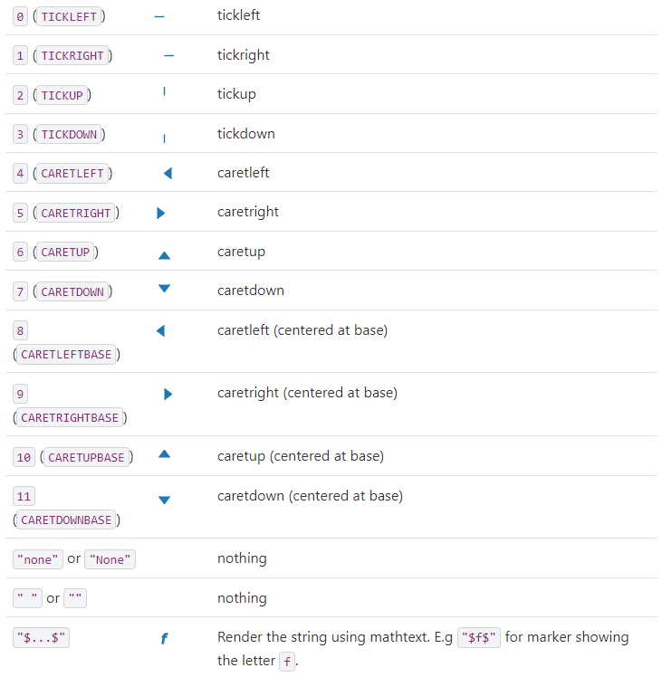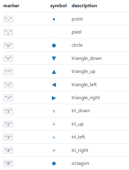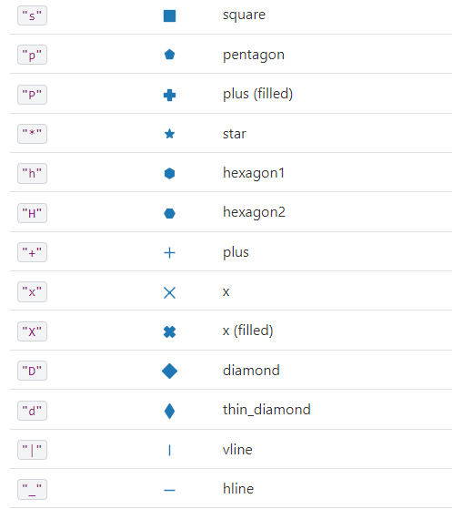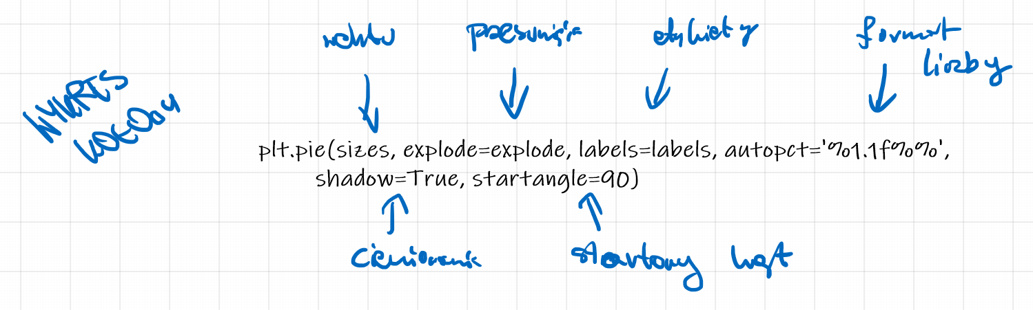 plt.show()plt.scatter(x, y, marker=">", color="brown", alpha=0.5, s=area) tworzy wykres punktowy (scatter plot) x: lista lub tablica współrzędnych x punktów na wykresie. y: lista lub tablica współrzędnych y punktów na wykresie. Wartości x i y muszą mieć tę samą długość, aby przedstawić każdy punkt na wykresie. marker: symbol reprezentujący kształt punktów na wykresie. W tym przypadku, używamy ">" co oznacza strzałkę skierowaną w prawo. color: kolor punktów na wykresie. W tym przypadku, używamy koloru “brown” (brązowy). alpha: przezroczystość punktów na wykresie, gdzie wartość 1 oznacza całkowitą nieprzezroczystość, a 0 całkowitą przezroczystość. W tym przypadku, używamy wartości 0.5 co oznacza półprzezroczystość punktów. s: rozmiar punktów na wykresie, który może być pojedynczą wartością lub listą/tablicą wartości o długości takiej samej jak współrzędne x i y.