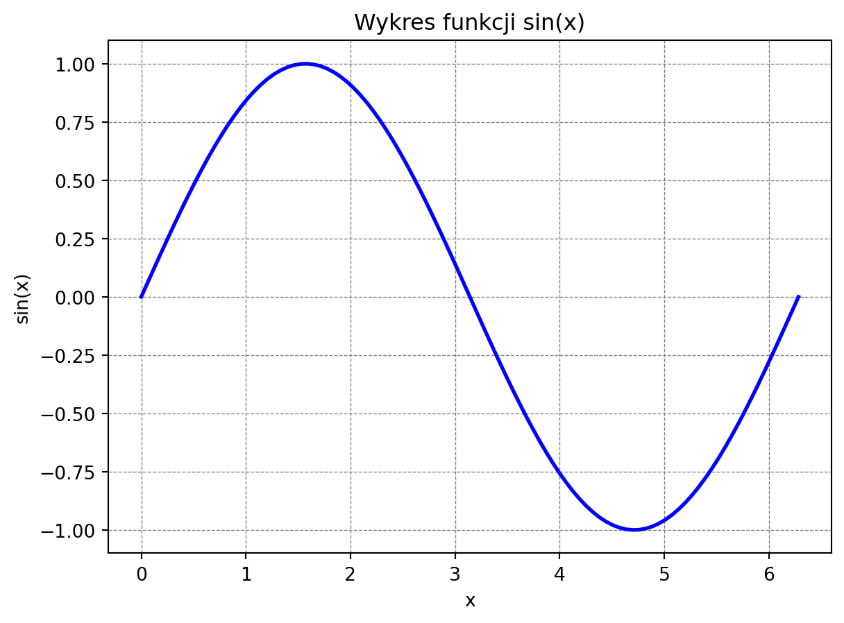 y = np.sin(x): oblicza wartości funkcji sinus dla każdej wartości x. Wynikowe wartości są zapisane w tablicy y.