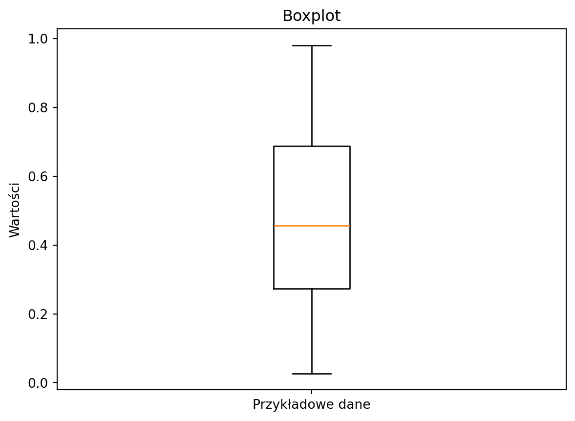 Wykres pudełkowy pokazuje pięć statystyk opisowych danych: minimum, pierwszy kwartyl (Q1), medianę, trzeci kwartyl (Q3) i maksimum.