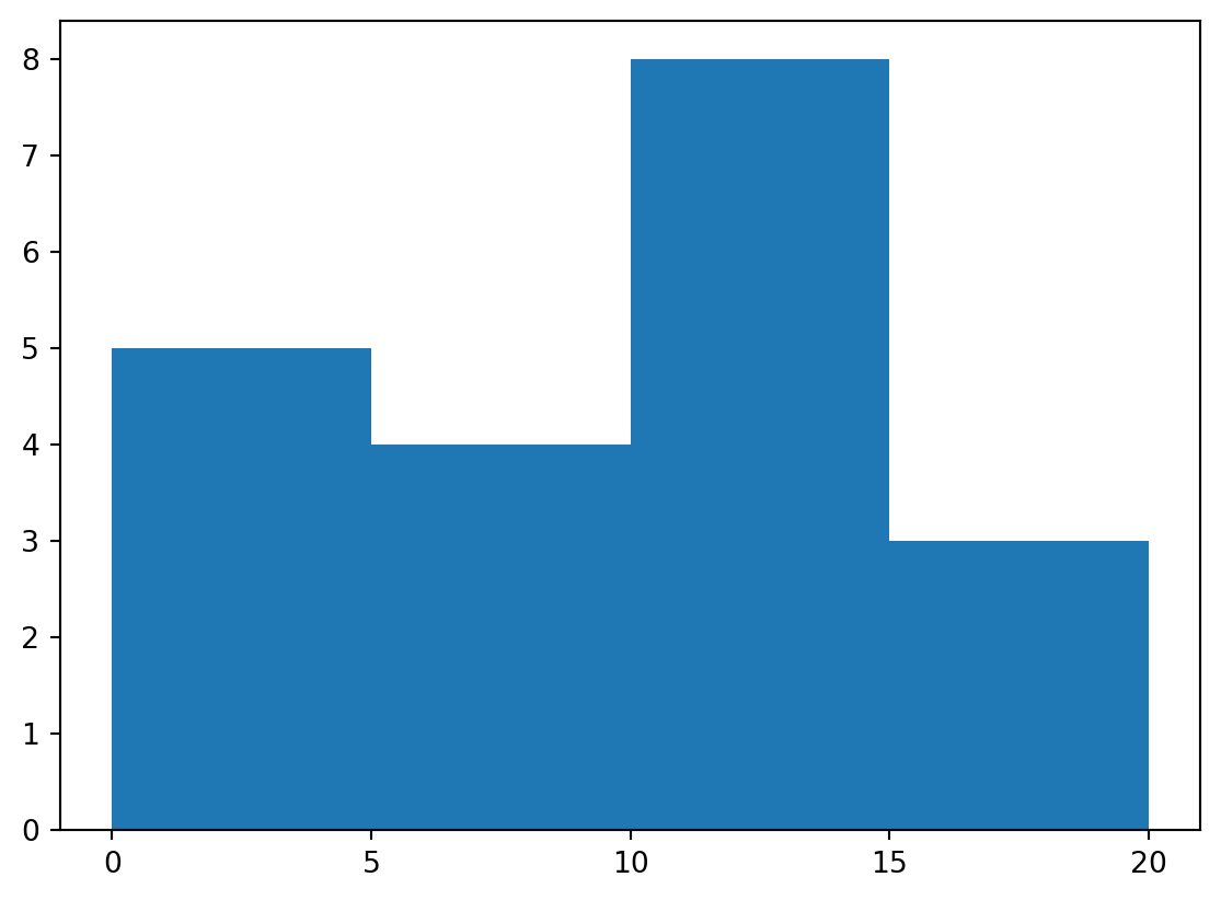plt.hist(x, bins=[0, 5, 10, 15, 20])