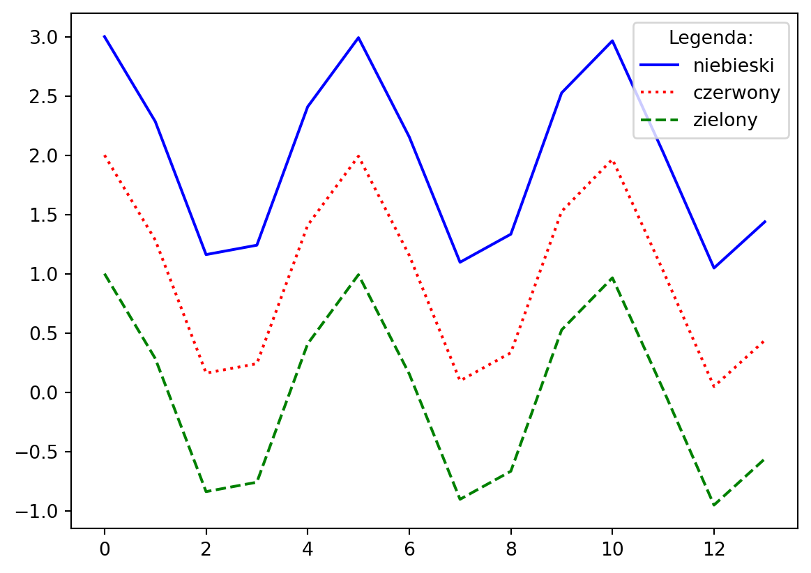 plt.plot(x, y + 2, 'blue', linestyle="-", label="niebieski"): rysuje niebieski wykres z wartościami z tablicy x, a wartości y przesunięte o 2 w górę. Linia jest ciągła (linestyle="-").