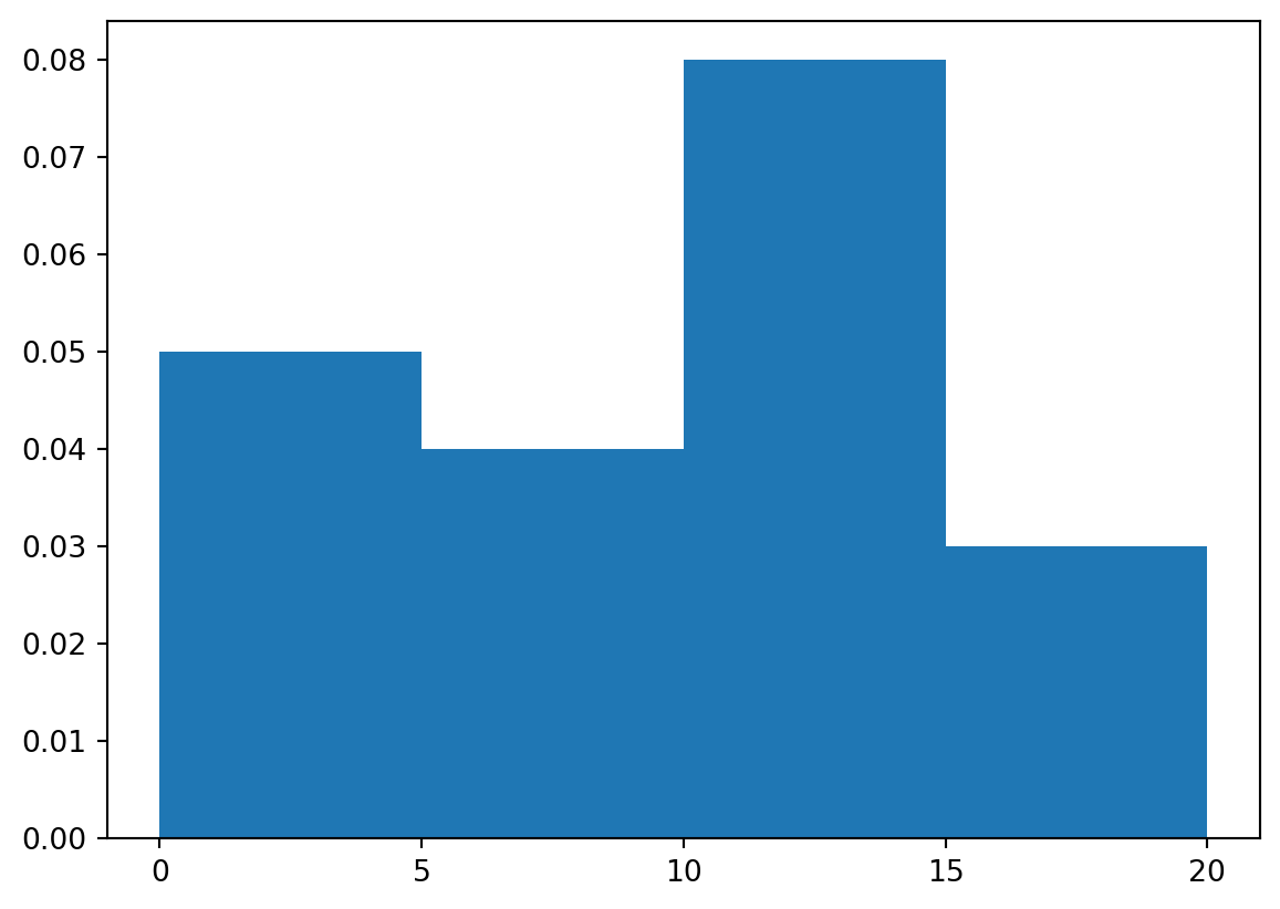 plt.hist(x, bins=[0, 5, 10, 15, 20], density=True)