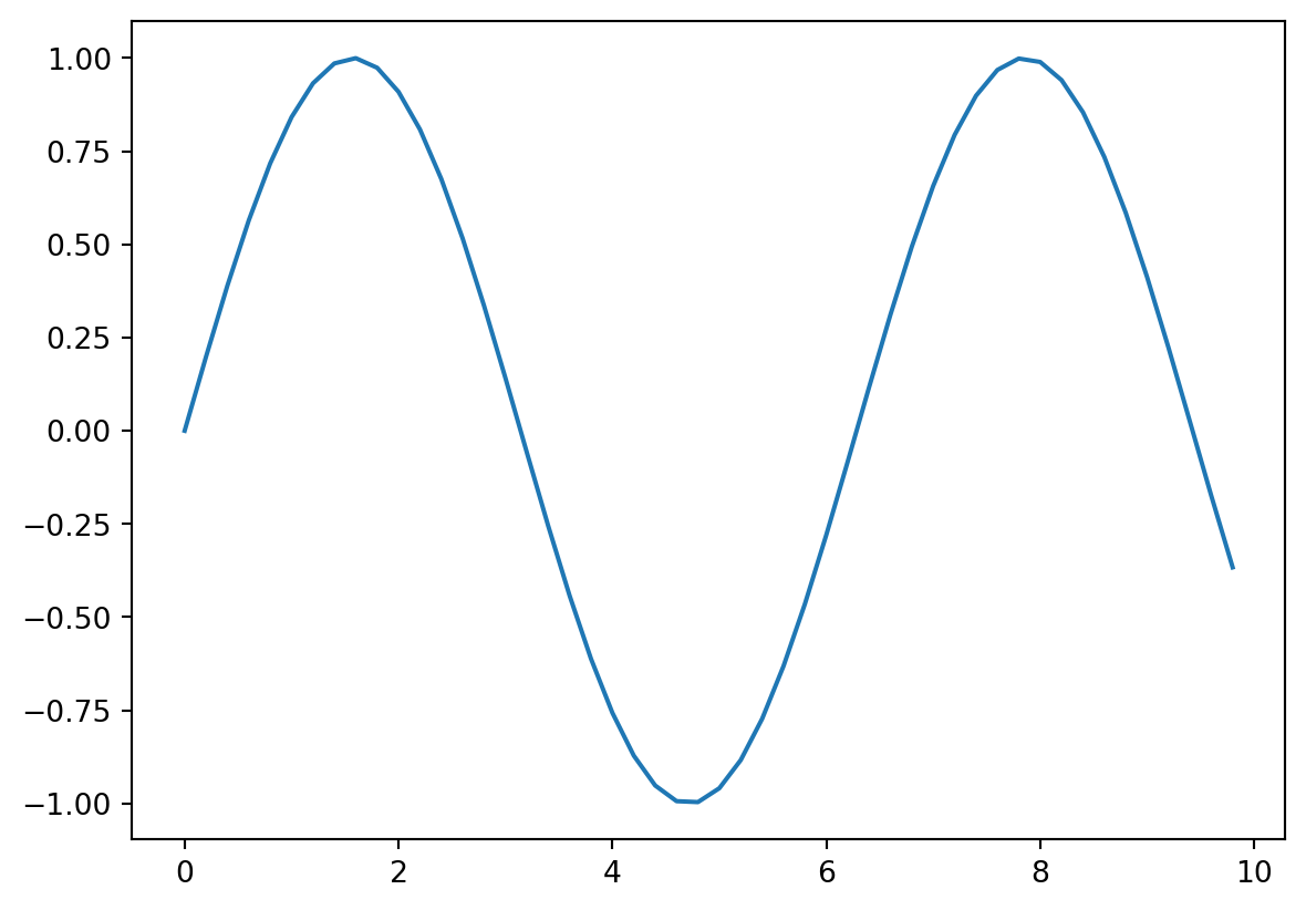 5plt.show()x = np.arange(0, 10, 0.2): tworzy tablicę x z wartościami od 0 do 10 (bez 10) z krokiem 0.2, korzystając z funkcji arange z biblioteki numpy.