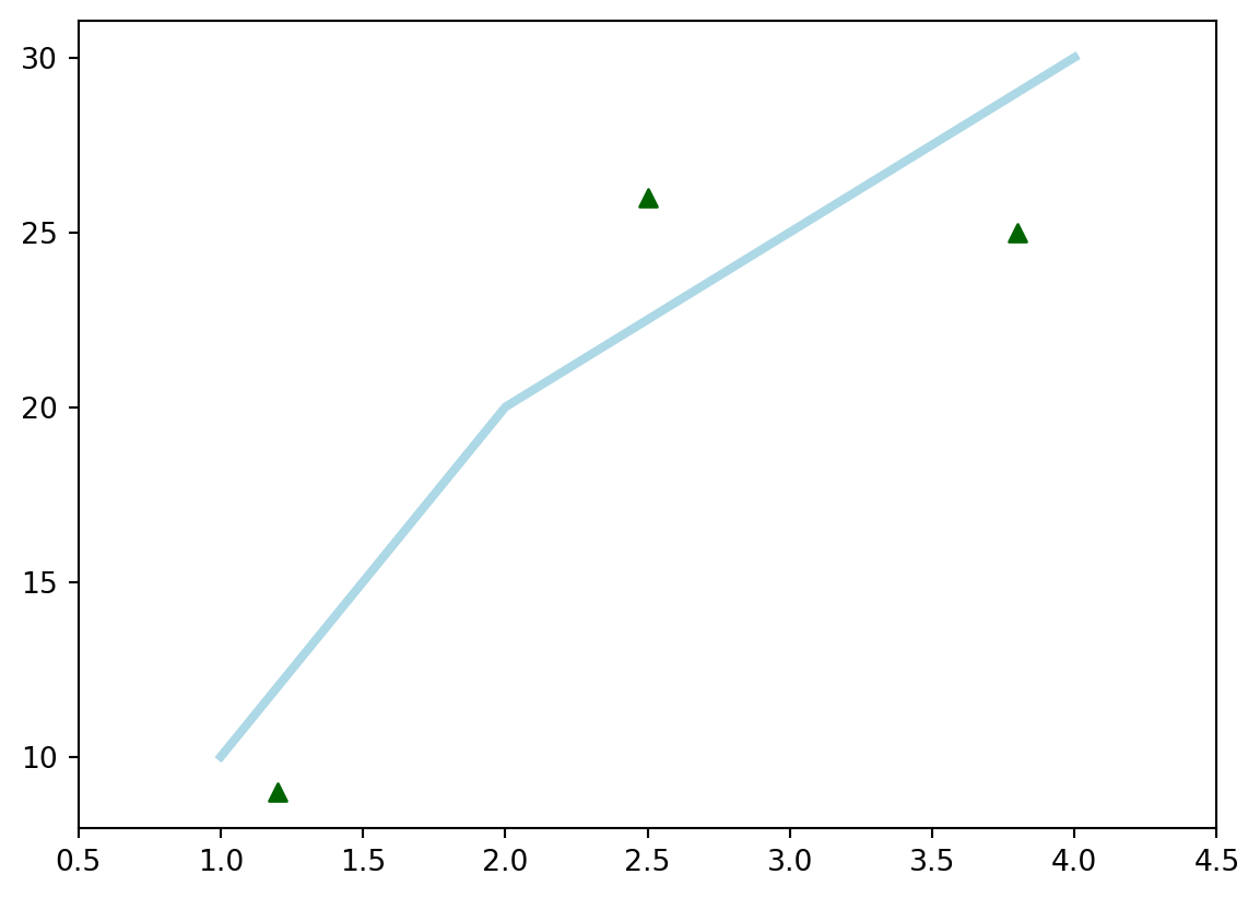ax.scatter([0.3, 3.8, 1.2, 2.5], [11, 25, 9, 26], color='darkgreen', marker='^'): dodaje punkty w kształcie trójkątów (‘^’) na osiach ax w miejscach określonych przez listy wartości [0.3, 3.8, 1.2, 2.5] dla osi X i [11, 25, 9, 26] dla osi Y. Punkty są w kolorze ciemnozielonym.