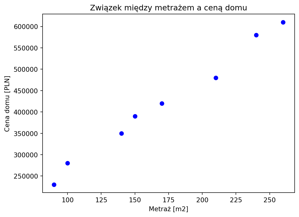 plt.show()plt.scatter(square_meters, house_prices, color='blue', marker='o'): tworzy wykres punktowy (scatter plot) z metrażem domów na osi X (square_meters) i cenami domów na osi Y (house_prices). Punkty są koloru niebieskiego (color='blue') i mają kształt kółka (marker='o').