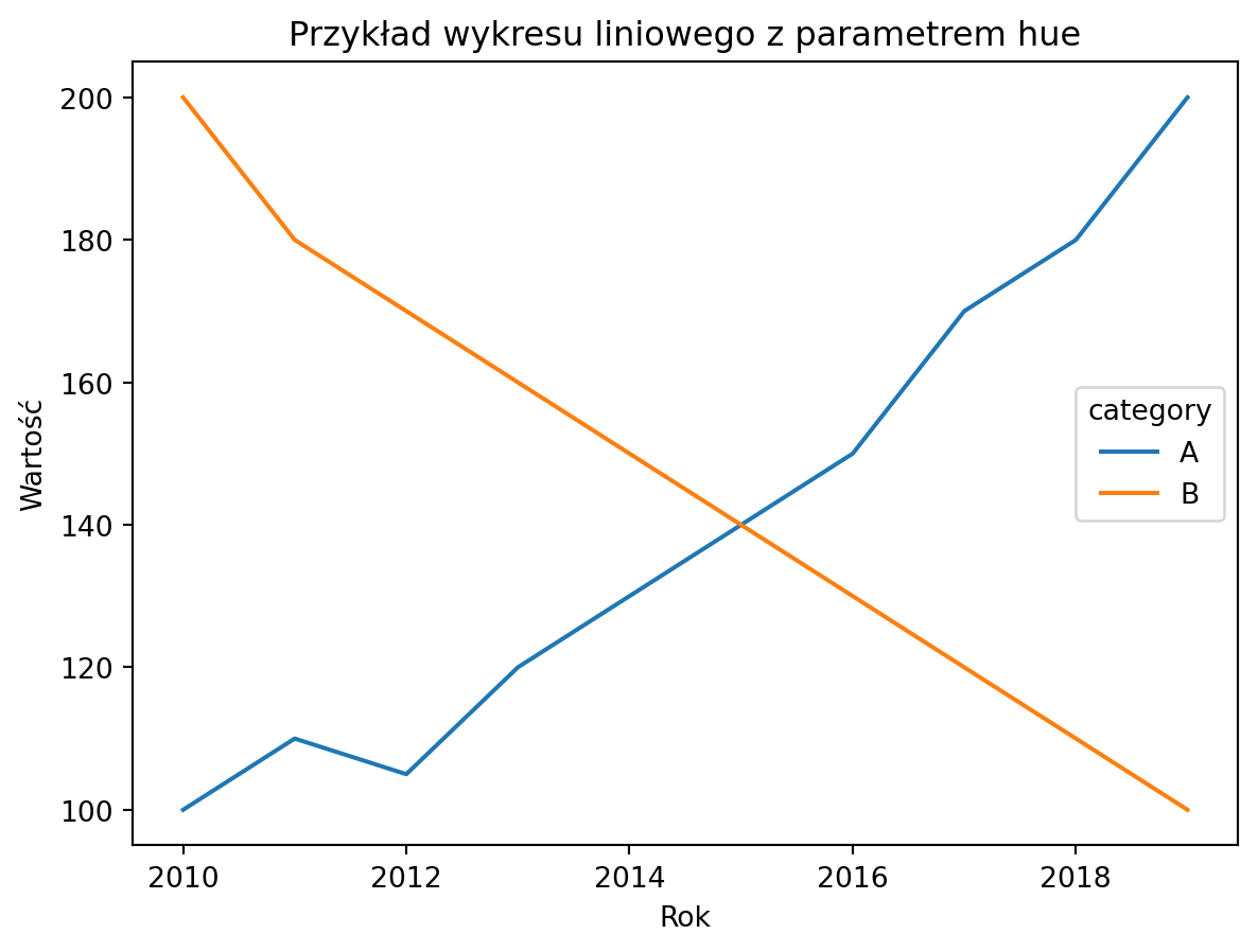 import seaborn as snsimport matplotlib.pyplot as pltimport pandas as pd# Przykładowe danedata = {'year': [2010, 2011, 2012, 2013, 2014, 2015, 2016, 2017, 2018, 2019] *2,'value': [100, 110, 105, 120, 130, 140, 150, 170, 180, 200] + [200, 180, 170, 160, 150, 140, 130, 120, 110, 100],'category': ['A'] *10+ ['B'] *10}# Ładowanie danych jako ramki danych Pandasdf = pd.DataFrame(data)# Tworzenie wykresu liniowego z parametrem 'hue'sns.lineplot(x='year', y='value', hue='category', data=df)# Dodanie tytułu i etykiet osiplt.title('Przykład wykresu liniowego z parametrem hue')plt.xlabel('Rok')plt.ylabel('Wartość')# Wyświetlenie wykresuplt.show()
