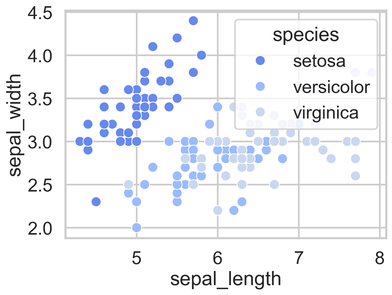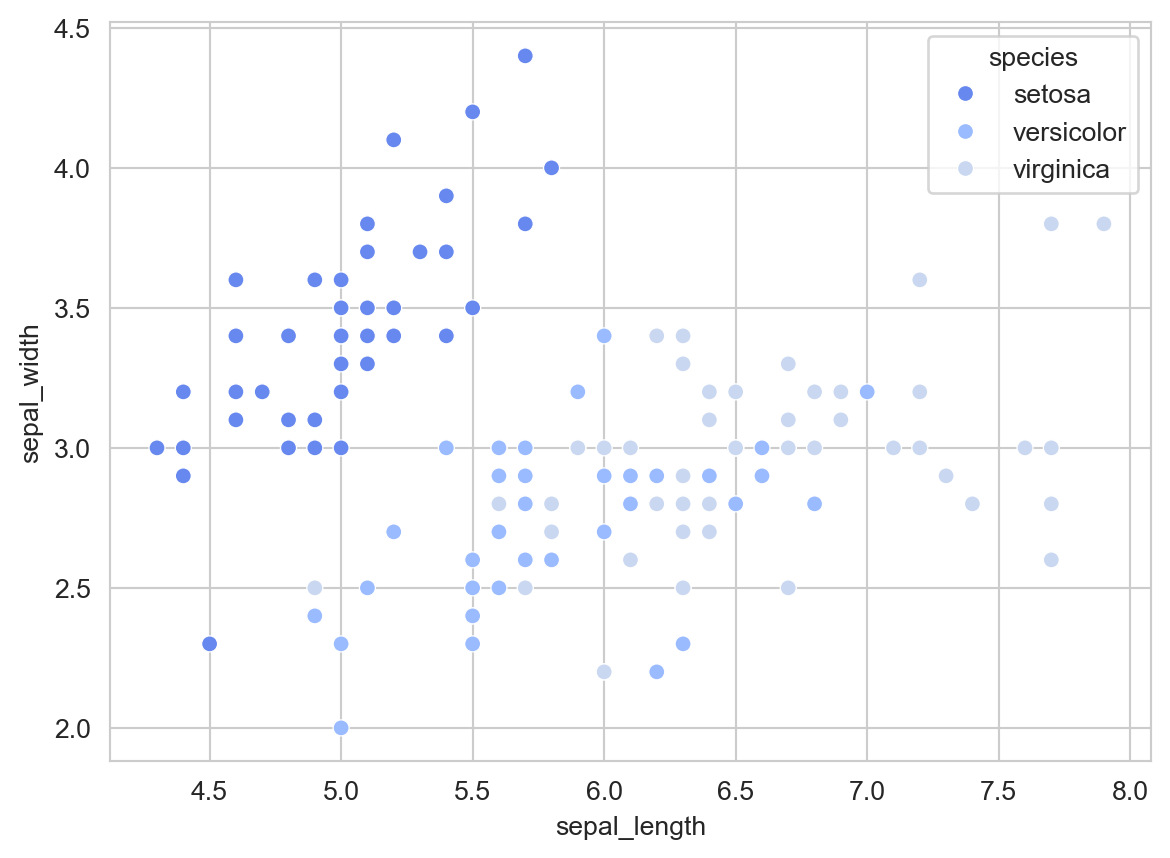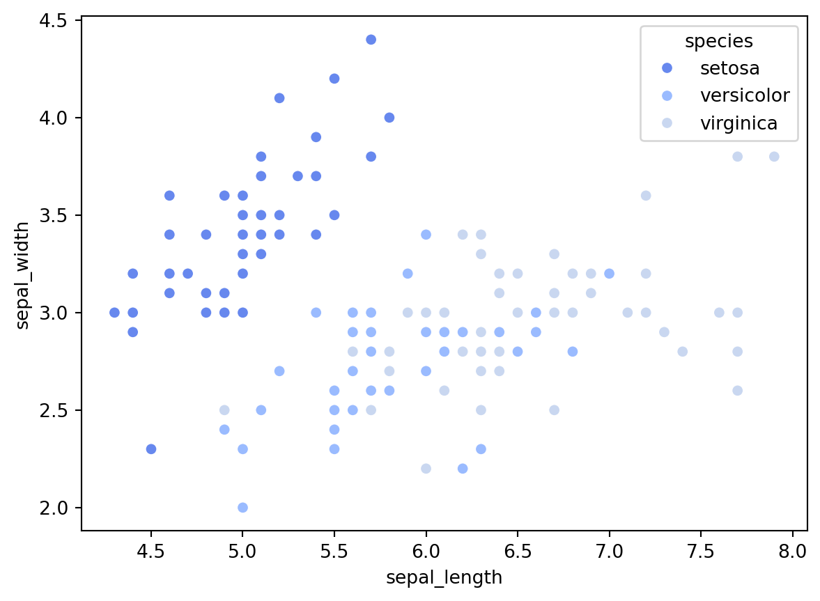 import seaborn as snsimport matplotlib.pyplot as pltiris_data = sns.load_dataset('iris')# Ustawienie palety kolorów 'coolwarm'sns.set_palette('coolwarm')sns.scatterplot(x='sepal_length', y='sepal_width', hue='species', data=iris_data)plt.show()