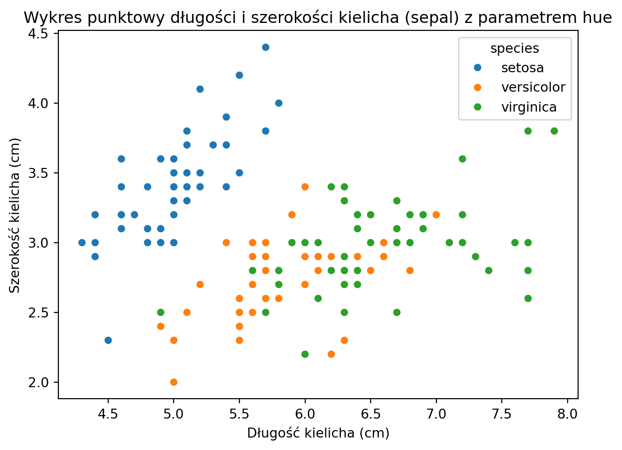 import seaborn as snsimport matplotlib.pyplot as plt# Ładowanie danychiris_data = sns.load_dataset('iris')# Tworzenie wykresu punktowego z parametrem 'hue'sns.scatterplot(x='sepal_length', y='sepal_width', hue='species', data=iris_data)# Dodanie tytułu i etykiet osiplt.title('Wykres punktowy długości i szerokości kielicha (sepal) z parametrem hue')plt.xlabel('Długość kielicha (cm)')plt.ylabel('Szerokość kielicha (cm)')# Wyświetlenie wykresuplt.show()