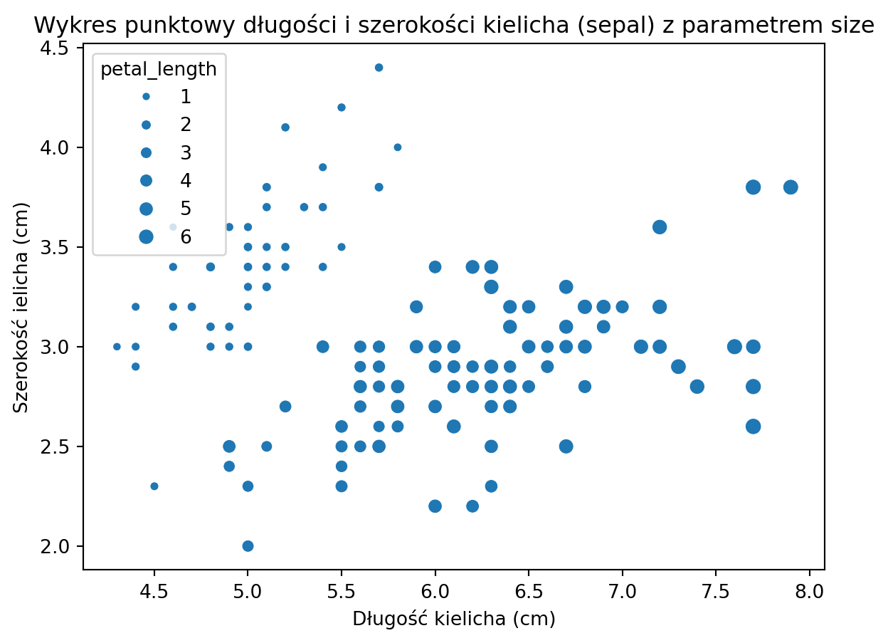 import seaborn as snsimport matplotlib.pyplot as plt# Ładowanie danychiris_data = sns.load_dataset('iris')# Tworzenie wykresu punktowego z parametrem 'size'sns.scatterplot(x='sepal_length', y='sepal_width', size='petal_length', data=iris_data)# Dodanie tytułu i etykiet osiplt.title('Wykres punktowy długości i szerokości kielicha (sepal) z parametrem size')plt.xlabel('Długość kielicha (cm)')plt.ylabel('Szerokość ielicha (cm)')# Wyświetlenie wykresuplt.show()