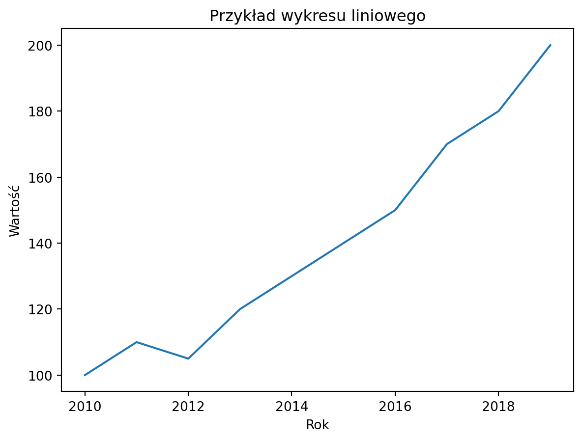 import seaborn as snsimport matplotlib.pyplot as plt# Przykładowe danedata = {'year': [2010, 2011, 2012, 2013, 2014, 2015, 2016, 2017, 2018, 2019],'value': [100, 110, 105, 120, 130, 140, 150, 170, 180, 200]}# Ładowanie danych jako ramki danych Pandasimport pandas as pddf = pd.DataFrame(data)# Tworzenie wykresu liniowegosns.lineplot(x='year', y='value', data=df)# Dodanie tytułu i etykiet osiplt.title('Przykład wykresu liniowego')plt.xlabel('Rok')plt.ylabel('Wartość')# Wyświetlenie wykresuplt.show()